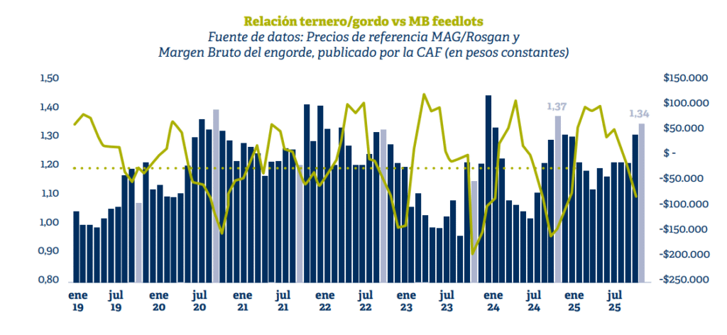 Ese cambio en la composición empuja a los feedlots a competir por animales de buena genética y condición, encareciendo la entrada y limitando las oportunidades de “comprar lote bueno y barato”. Además, la relación ternero-gordo en octubre marcó 1,34, por encima del promedio histórico cercano a 1,25 para ese mes. Cuando el ternero se encarece por encima del gordo, la ecuación de engorde se ajusta y la selección se vuelve más crítica: cualquier error sanitario o productivo cuesta el doble.