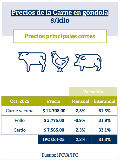 A esto se suma un consumo interno que no se desplomó. Con un promedio de 49,6 kg/hab/año, el mercado argentino continúa siendo uno de los principales consumidores de carne vacuna del mundo. La estabilidad del consumo, combinada con el refuerzo estacional de fin de año, genera una presión adicional. Incluso si el poder adquisitivo está limitado, diciembre es un mes donde el consumidor compra más carne de manera casi automática.