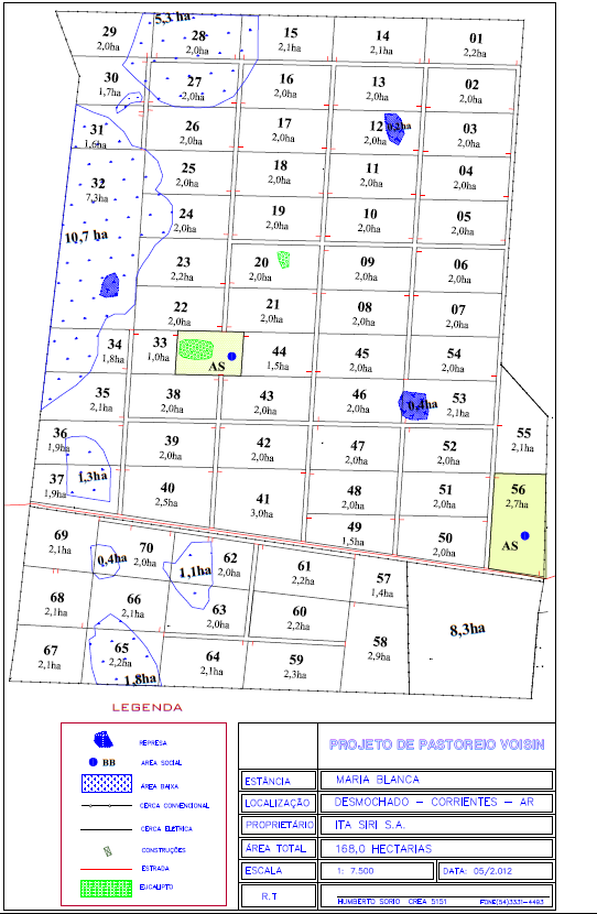 El siguiente plano realizado por la consultoría SORIO & ARESI demuestra cómo se diseña e implementa un módulo de Pastoreo Racional Voisin (PRV). Se parte de una superficie total de 168 hectáreas, que se divide inicialmente en 70 potreros de 2 hectáreas cada uno. Esta división permite manejar adecuadamente los tiempos de ocupación y descanso del pasto, siguiendo las leyes del PRV.