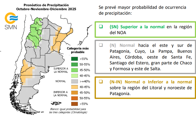 El SMN recuerda que este tipo de pronósticos son de carácter estacional y marcan una tendencia promedio. No predicen eventos puntuales, por lo que fenómenos de corta duración —como tormentas intensas, frentes fríos o calor extremo— pueden presentarse igualmente. El trimestre se presenta con lluvias normales en la mayor parte del país, aunque con focos de déficit en el Litoral y Patagonia y excesos en el NOA. A esto se suma un escenario de temperaturas superiores a lo normal en la zona central, lo que puede aumentar el riesgo de estrés calórico en la hacienda. Frente a este panorama, es clave planificar reservas forrajeras y suplementación donde las lluvias sean escasas, reforzar el suministro de agua y sombra en los rodeos, y ajustar planes sanitarios ante la posible mayor presión de parásitos. Una buena anticipación en el manejo puede marcar la diferencia en la productividad de la próxima campaña.