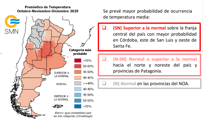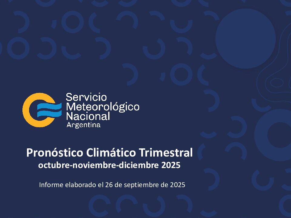 El Servicio Meteorológico Nacional (SMN) presentó su pronóstico climático trimestral para octubre, noviembre y diciembre de 2025. El informe indica que el último tramo del año estará caracterizado por temperaturas superiores a lo normal en gran parte del país, mientras que las lluvias se ubicarán dentro de los valores normales en la mayoría de las regiones.